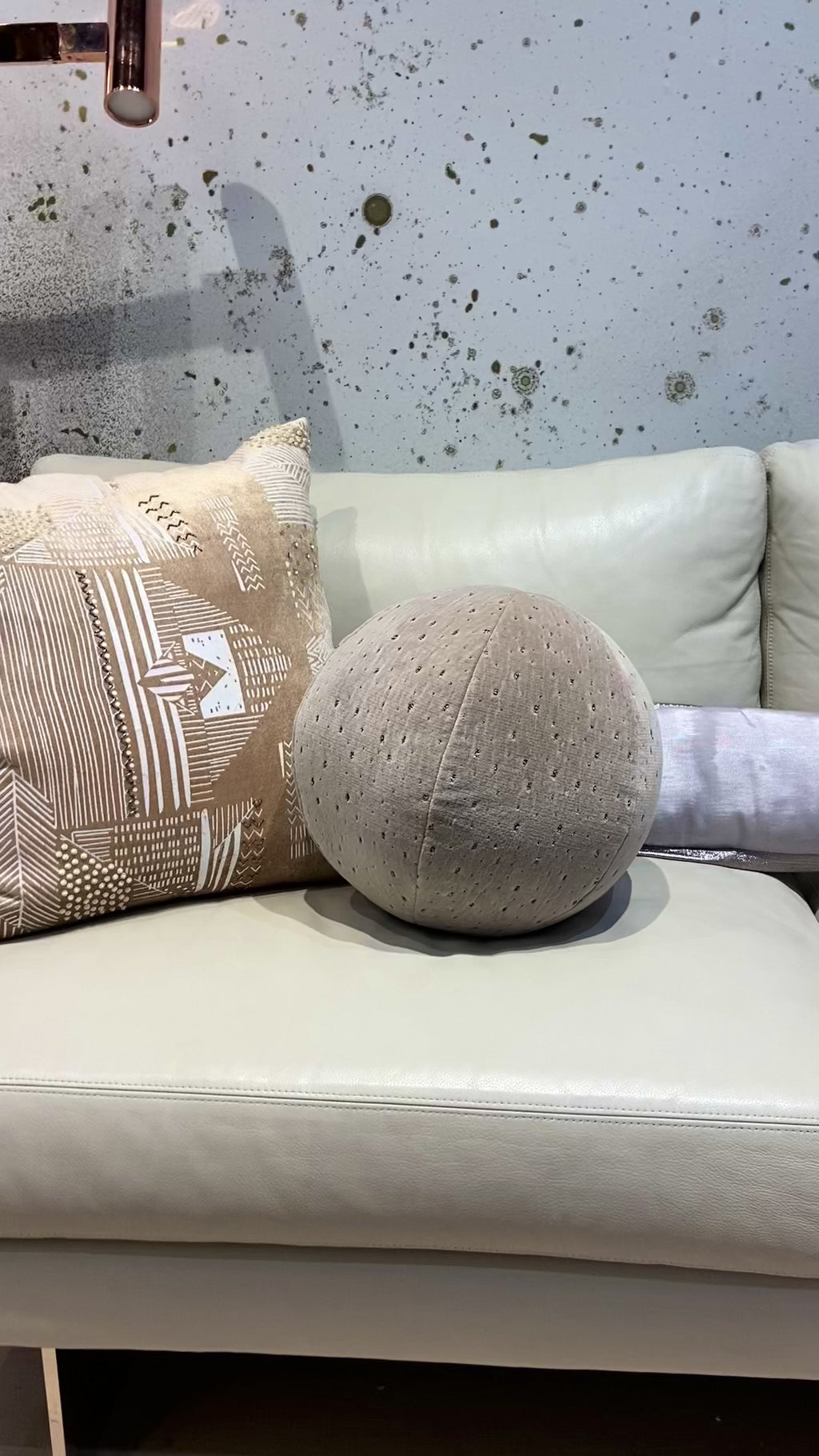 A playful yet sophisticated accent, this round velvet pillow features a soft beige base with subtle dotted detailing. Its smooth, plush texture and sculptural ball shape bring warmth and modern charm to any space.